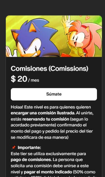 1. Ingresa a Patreon y busca el usuario “Anne Valentine”2. Una vez en el perfil, haz clic en “Ver las opciones de suscripción”.3. Busca el tier llamado “Comisiones (Commissions)” y presiona “Súmate”.4. En la pantalla de pago, ubica la casilla de “Monto a pagar” (por defecto aparece $20).