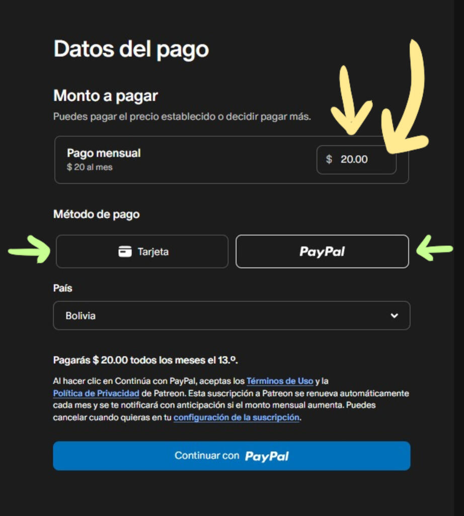6. Completa el pago utilizando tarjeta o PayPal.7. Patreon realizará el cobro de forma inmediata.8. Una vez confirmado el pago completo, debes eliminar/cancelar la suscripción al día siguiente, para evitar que Patreon realice un cobro automático el mes siguiente.9. ¡Listo! Con el pago confirmado, la comisión entra en proceso .NOTAS: